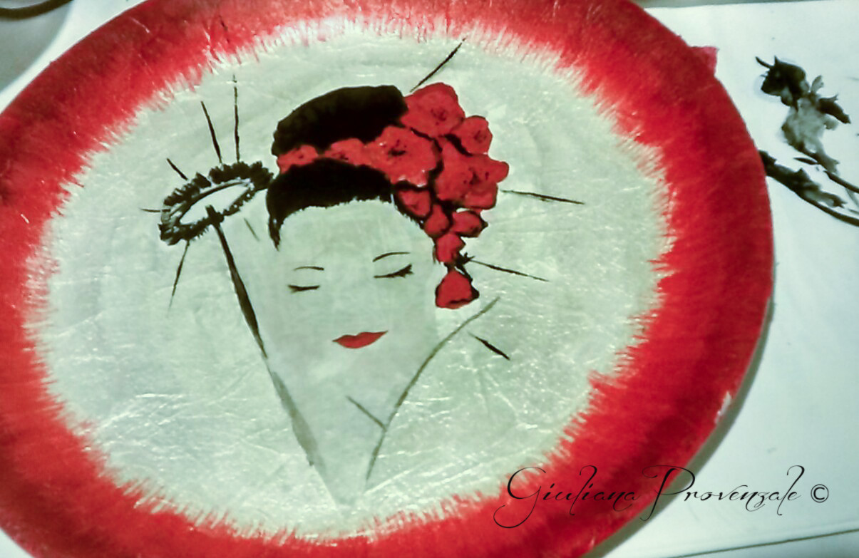 Preparazione: Applica una mano di fondo gesso acrilico per far risaltare meglio i colori dell’immagine su carta di riso e, una volta ben asciutto, incollare l’immagine.