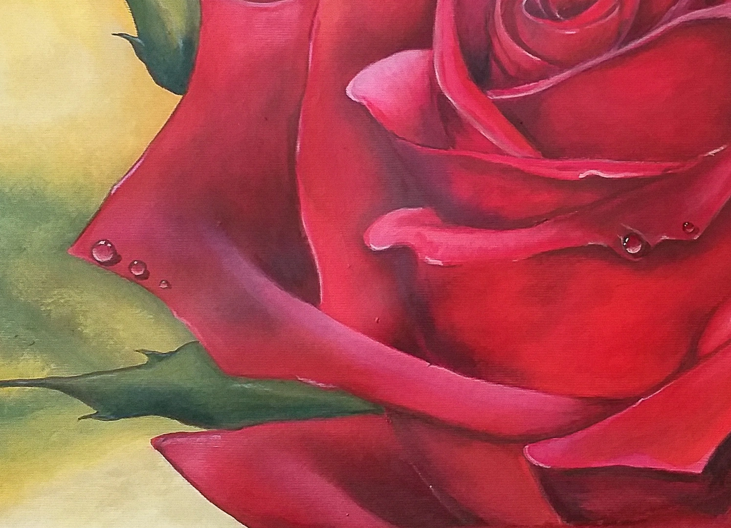 La rosa è resa con una meticolosa attenzione ai dettagli: i petali vellutati acquistano una profondità volumetrica quasi tattile grazie a sapienti giochi di luce e ombra, con gocce di rugiada cristallina sui petali, simboli di freschezza ma anche della natura effimera della vita. Lo sfondo, etereo e vibrante, crea un potente contrasto cromatico che proietta il fiore verso l’osservatore.