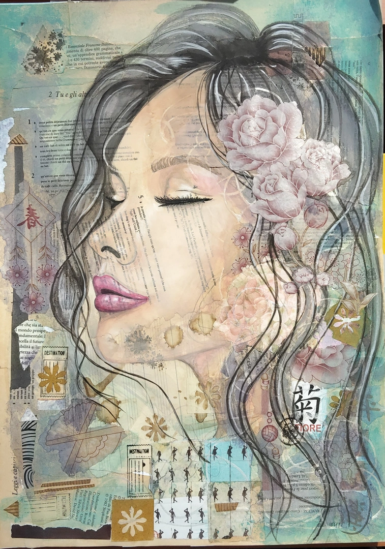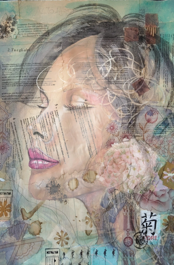 Il ritratto della donna diventa così un contenitore di storie — lette, vissute o sognate — avvolto in tonalità pastello che conferiscono al lavoro una qualità eterea. L’opera trasforma lo scarto in poesia, invitando l’osservatore a un ascolto silenzioso e universale.